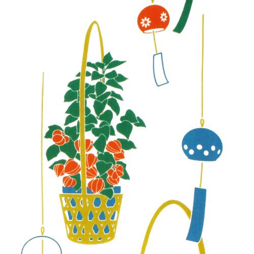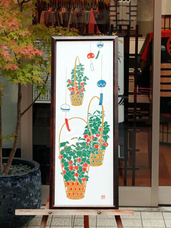 生き生きとしたほおずきと、涼しげな風鈴の姿を描きました。