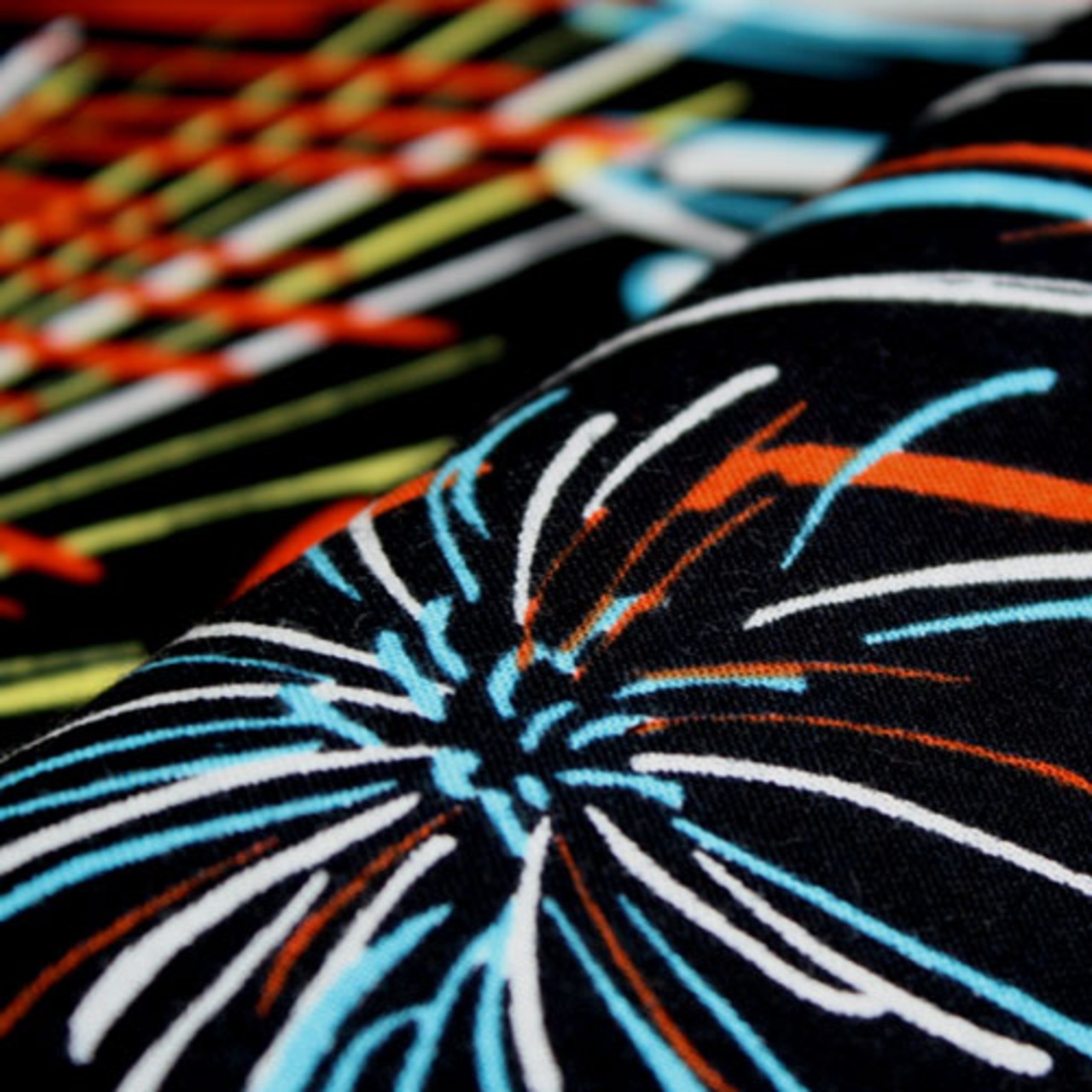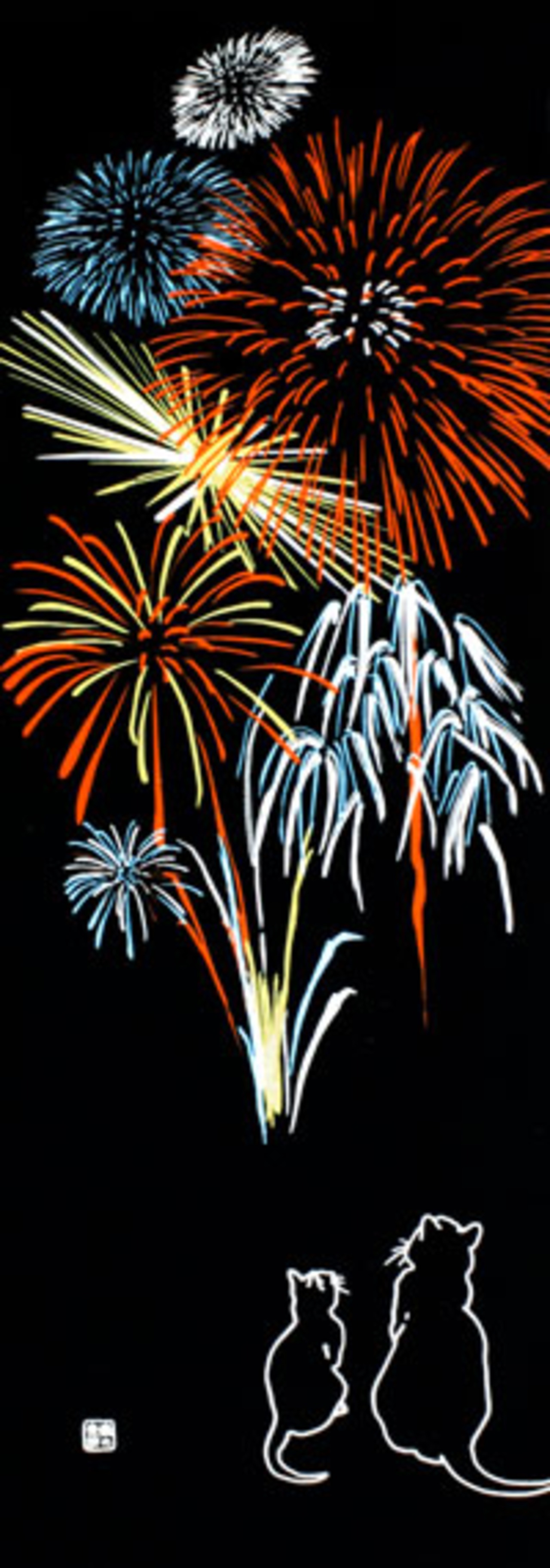 大胆な構図の中にも、手描きの暖かみを感じる花火と、