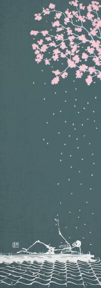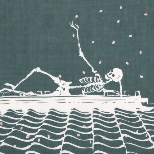 瓦屋根の上、まるでドクロが花見を楽しんでいるかのような、
