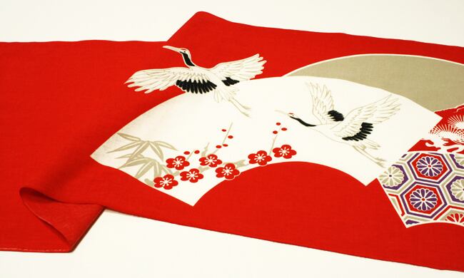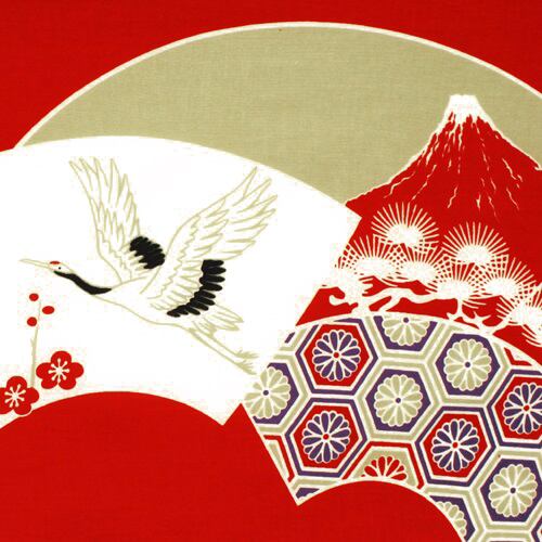 扇の面に松竹梅と亀甲、赤富士に鶴を描きました。