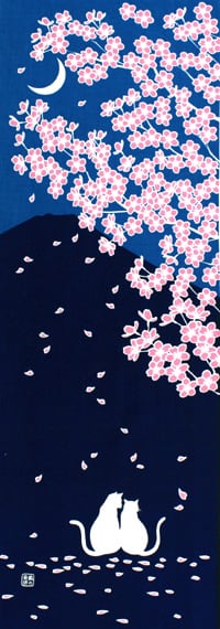 桜の色が際立つ夜を背景に、2匹の猫が寄り添い合う…