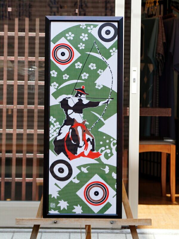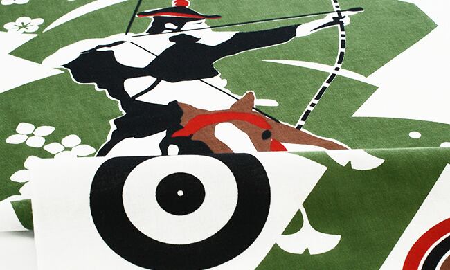 流鏑馬の射手を中心に、扇形で背景色を作り