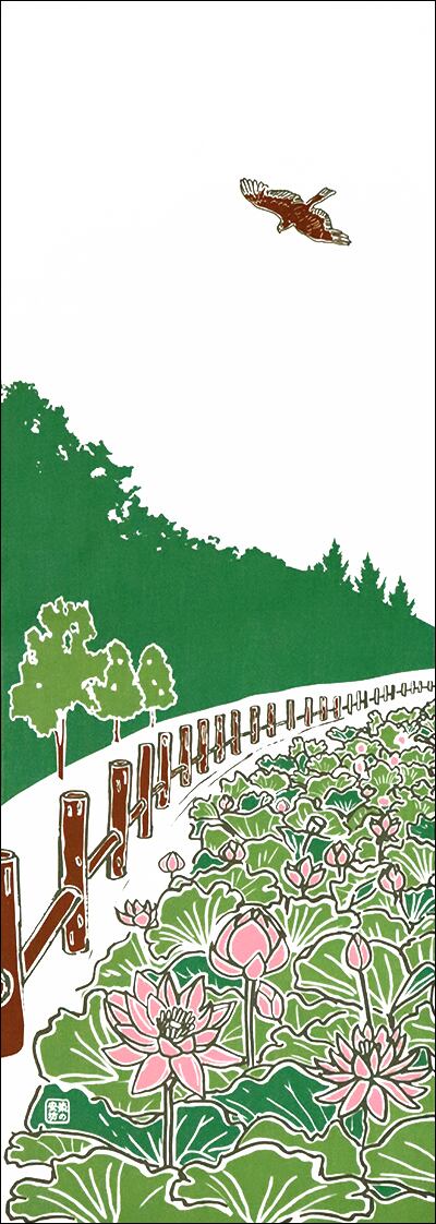 蓮咲く池の上の大空を羽ばたく優雅なトビの姿に